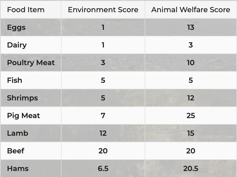 The worst animal welfare impacts come from pig meat, with the highest sentience at 0.48 and intensive farming, likely to experience suffering. Eggs stand out for their intensive farming, and dairy involves the longest durations of suffering (over 1,400 days).
